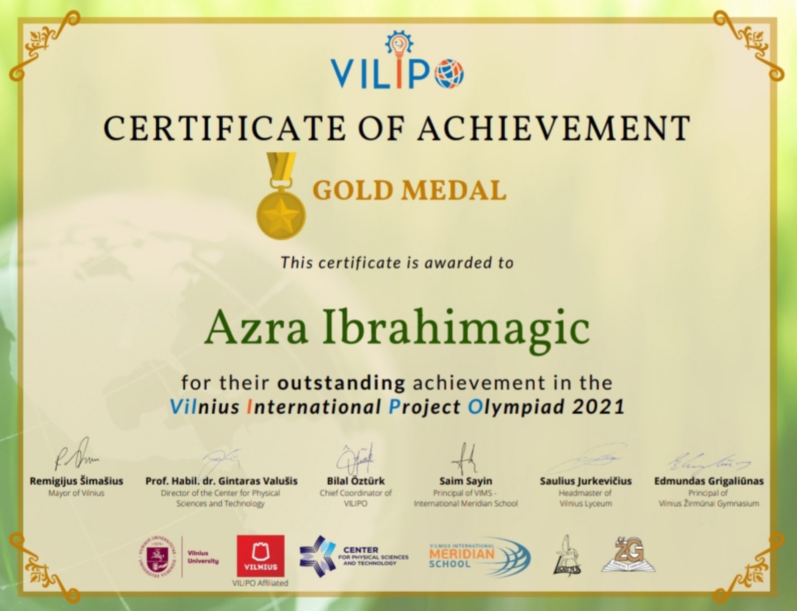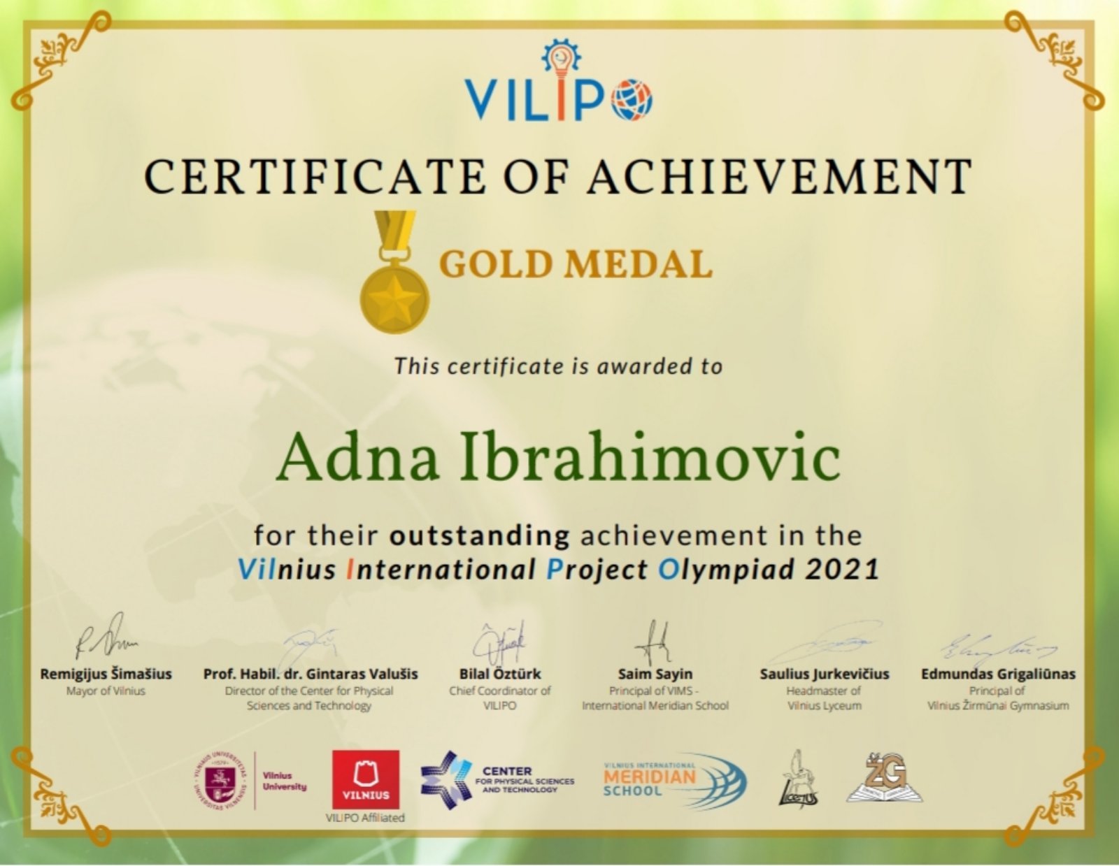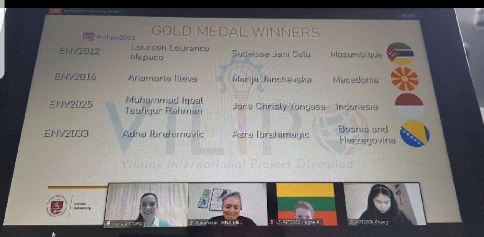 VILIPO (Vilnius International Project Olympiad) je uzbudljivo međunarodno takmičenje za učenike između 14 i 19 godina, koje se održava u Viljnusu, Litvanija, sa osnovnom idejom da probudi svijest i želju za naukom, umjetnošću i tehnologijom kod mladih ljudi, kako bi oni u budućnosti dali svoj doprinos zajednici. Ukazuje na ekološka pitanja, poput zagađenja zraka i vode i globalnog zagrijavanja, pa se u okviru VILIPO platforme učenicima daje prilika da kreiraju, izume i usavrše rad postojećih tehnologija kako bi zaustavili proces uništenja planete Zemlje. Učenici širom svijeta imaju priliku poslati svoj projekat na jednu od ponuđenih tema, a najbolje projekte bira stručni žiri, nakon čega oni učestvuju na svečanom proglašenju pobjednika u svakoj kategoriji.