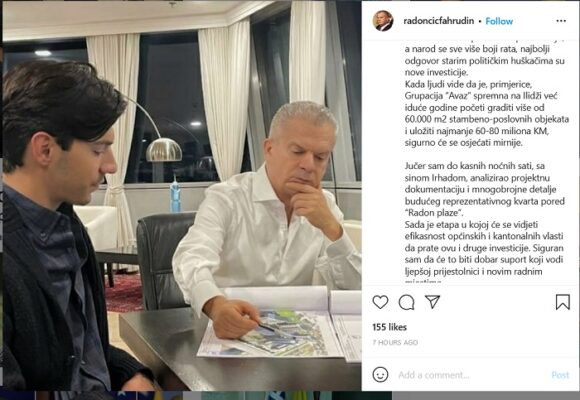 – Jučer sam do kasnih noćnih sati, sa sinom Irhadom, analizirao projektnu dokumentaciju i mnogobrojne detalje budućeg reprezentativnog kvarta pored “Radon plaze”. Sada je etapa u kojoj će se vidjeti efikasnost općinskih i kantonalnih vlasti da prate ovu i druge investicije. Siguran sam da će to biti dobar suport koji vodi ljepšoj prijestolnici i novim radnim mjestima – kazao je Radončić.