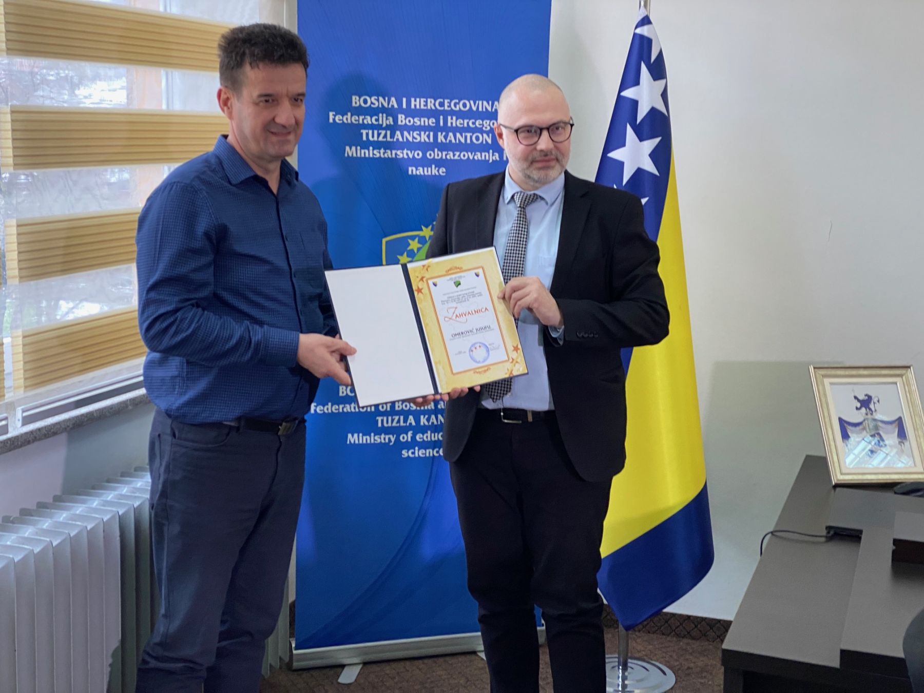 Ministar obrazovanja i nauke Tuzlanskog kantona Ahmed Omerović uručio je inspektorima za obrazovanje Vesimi Čičkušić i Jusufu Omeroviću javno priznanje „Zahvalnica“ za doprinos u razvoju i afirmaciji odgoja i obrazovanja na području Tuzlanskog kantona.