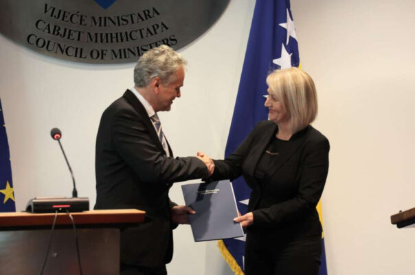 Predsjedavajuća Vijeća ministara Bosne i Hercegovine Borjana Krišto uručila je danas šefu Delegacije EU i specijalnom predstavniku EU u BiH ambasadoru Johannu Sattleru potpisani Sporazum o finansiranju Godišnjeg akcijskog plana u prilog Paketu za energetsku podršku za zapadni Balkan u korist BiH za 2023. godinu između Evropske unije i BiH.