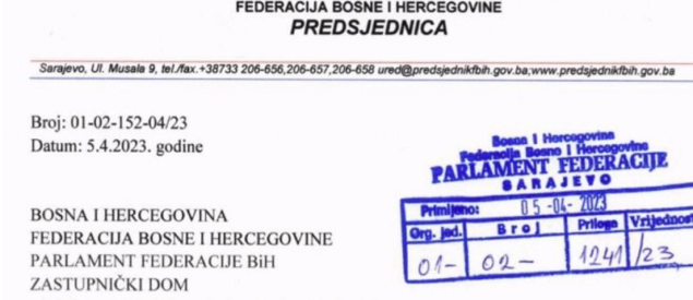 “Na navedenu Odluku sam zatražila saglasnost oba dopredsjednika Federacije BiH, te Vam dostavljam Saglasnost dopredsjednika Federacije BiH Igora Stojanovića od 4. aprila 2023. godine, i akt dopredsjednika Federacije BiH Refika Lende od 3. aprila 2023. godine, kojim odbija dati saglasnost na imenovanje Vlade Federacije BiH”, navodi se u dopisu koje je Bradara uputila predsjedavajućoj Predstavničkog doma PFBiH Mirjani Marinković Lepić.