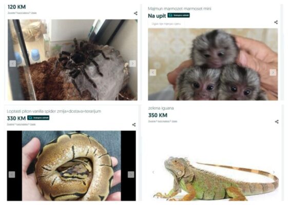 Na jednoj od najpopularnijoj oglasnih stranica za prodaju na internetu olx.ba, moguće je pronaći pitona za 350 KM, tarantule od 30 KM do 150 KM, iguanu za 350 KM, a tu su i majmuni, čija je cijena na upit.