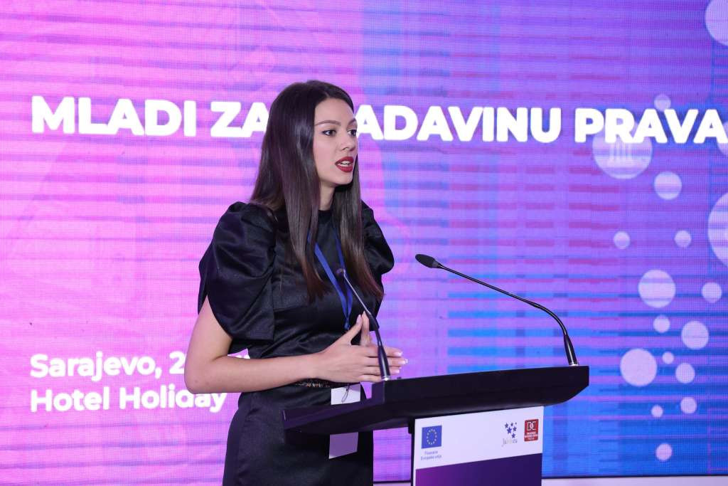 Rezultate projekta danas su na završnoj konferenciji predstavili Lara Sutović, ispred Udruženja Ja bih u EU, program menadžer Delegacije EU u BiH Enrico Visentin, predsjednica Udruženja žena sudija u BiH Amela Mahić Samardžić, koji su ukazali na važnost projekta „Mladi za vladavinu prava“.