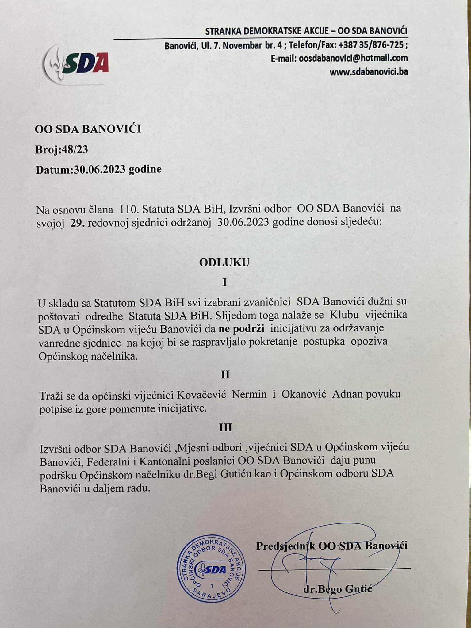 Izvršni odbor SDA Banovići kao i mjesni odbori, federalni i kantonalni poslanici OO SDA Banovići, vijećnici SDA u Općinskom vijeću Banovići, pružili su punu podršku općinskom načelniku dr.Begi Gutiću kao i Općinskom odboru SDA Banovići u daljem radu.