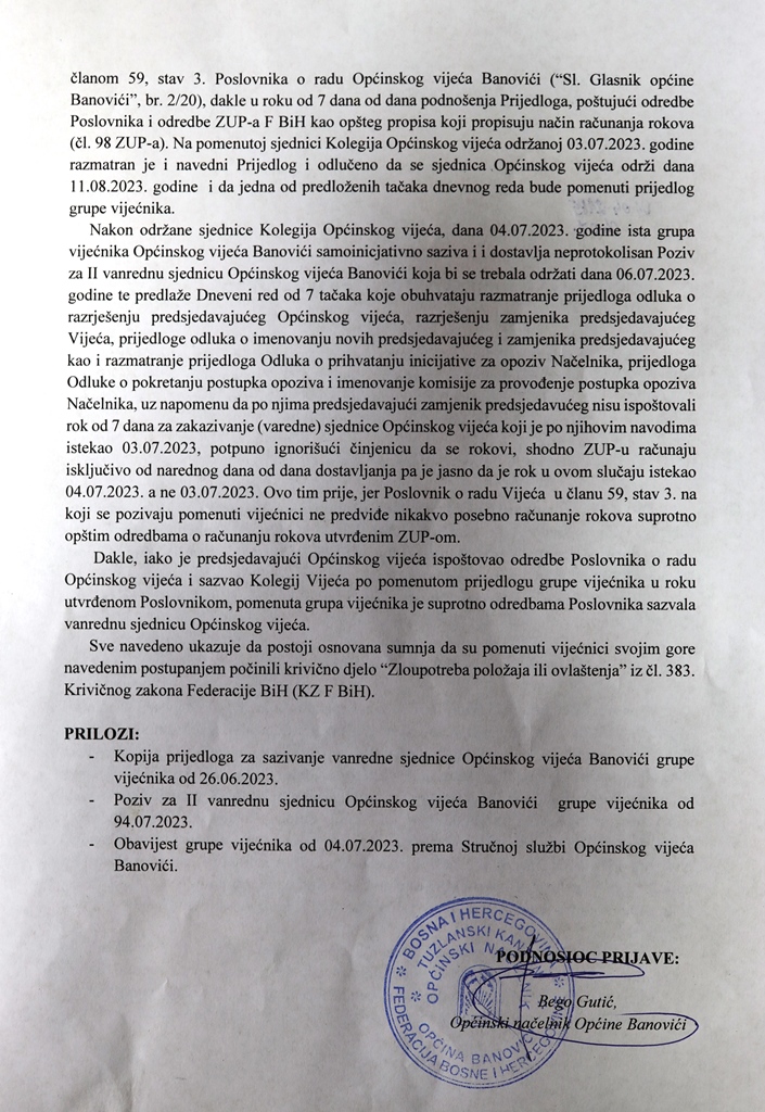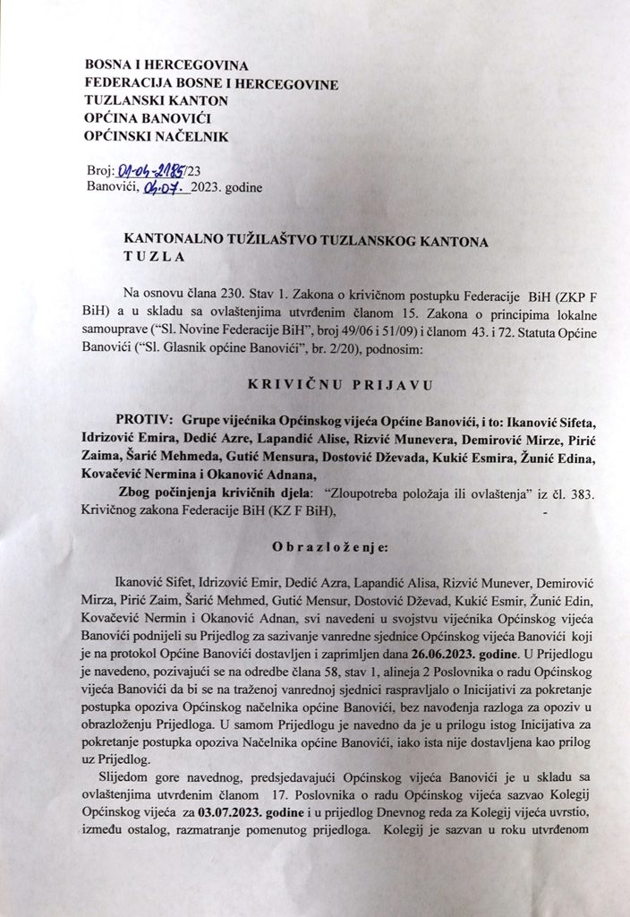 Obzirom na nelegalno i nezakonito sazivanje vanredne sjednice Općinskog vijeća Banovići, kao općinski načelnik uputio sam krivičnu prijavu protiv 14 vijećnika Kantonalno tužilaštvu Tuzlanskog kantona zbog grubog kršenja Zakona o principima lokalne samouprave, Statuta općine Banovići i Poslovnika o radu Općinskog vijeća Banovići, i to zbog zloupotrebe položaja˝.