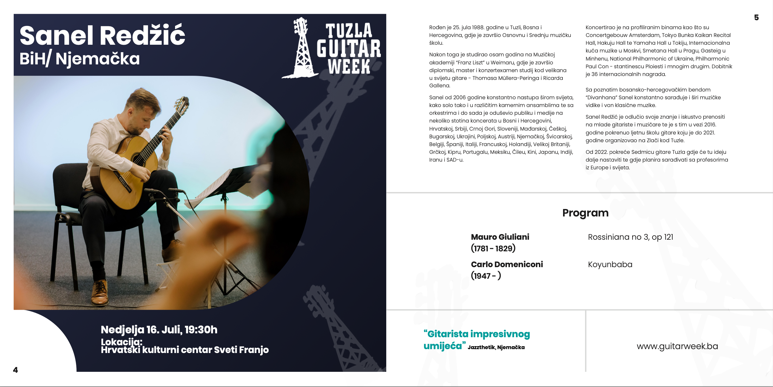 Program kojeg će izvoditi: Fernando Sor (Le Calme, op. 50), Toru Takemitsu (Equinox 1993), Ferdinand Rebay (Sonata in A 1994, Allegro moderato, Thema mit Variationen, Tanz/Rondo), Edino Krieger (Ritmata 1973).