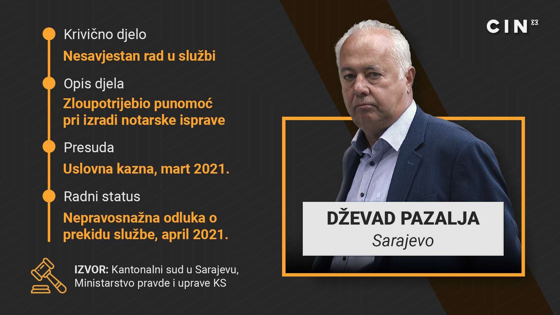 Pravosnažno rješenje o prestanku službe notara nije doneseno ni u slučaju Dževada Pazalje. On je ostao bez posla 2021. nakon što je osuđen uslovno na godinu dana zatvora s rokom kušnje od dvije godine zato što je napravio ugovor o hipoteci bez adekvatne punomoći. Pazalja je pokrenuo parnicu da bi osporio rješenje o prestanku službe i zadržao posao.