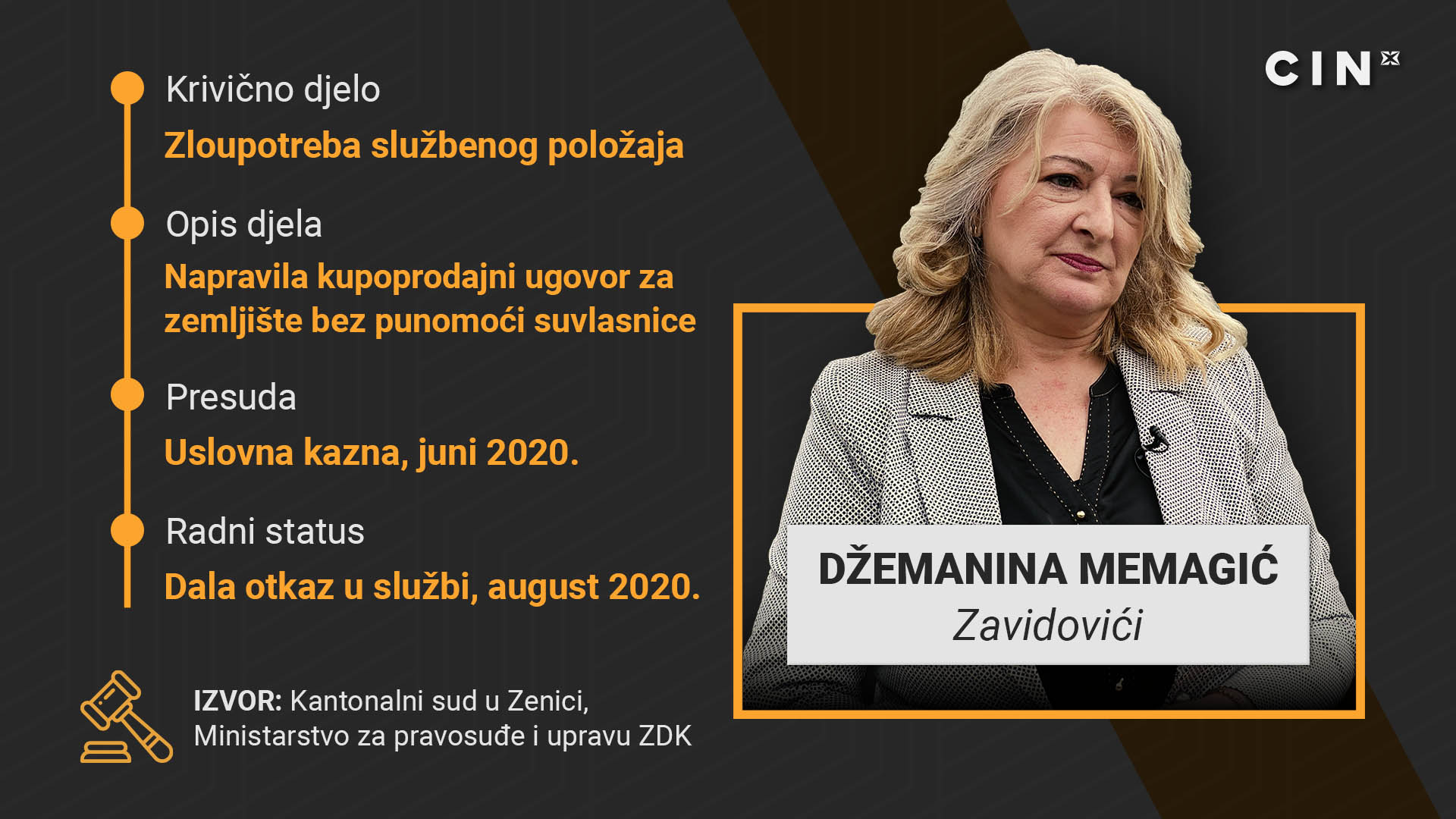 Memagić je 2020. godine dobila uslovnu presudu s kaznom od deset mjeseci zatvora i rokom od dvije godine. Ona je četiri godine ranije napravila kupoprodajni ugovor bez prisustva suvlasnice zemljišta Melihe Sarajlić, umjesto koje se, bez punomoći, potpisao njen brat.