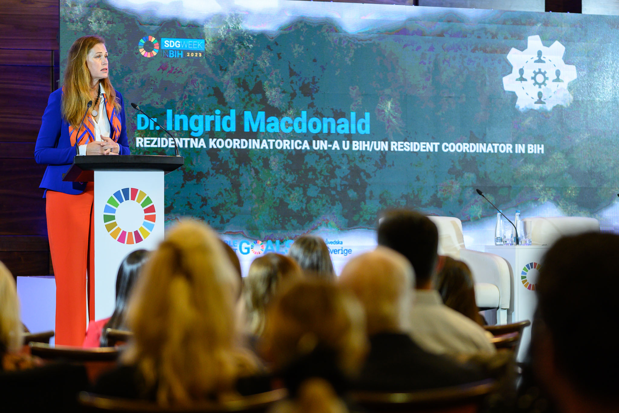 Rezidentna koordinatorica Ujedinjenih nacija u BiH, dr. Ingrid Macdonald, predstavila je 17 događanja koja će se odvijati tokom Sedmice održivih razvojnih ciljeva, a koja se dotiču tema kao što su mogućnost financijskih ulaganja, zelena tranzicije, digitalna transformacija, inkluzija osoba sa invaliditetom, osnaživanje žena itd. Potaknula je sve na sudjelovanje i pronalaženje konkretnih rješenja, neophodnih za rješavanje krize održivog razvoja s kojom se suočavaju planeta i čovječanstvo, a to uključuje i Bosnu i Hercegovinu.