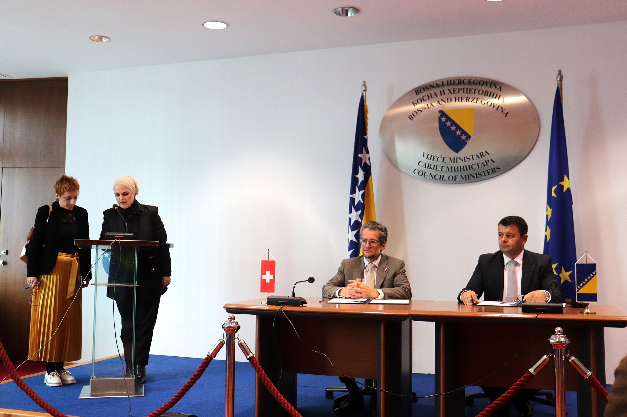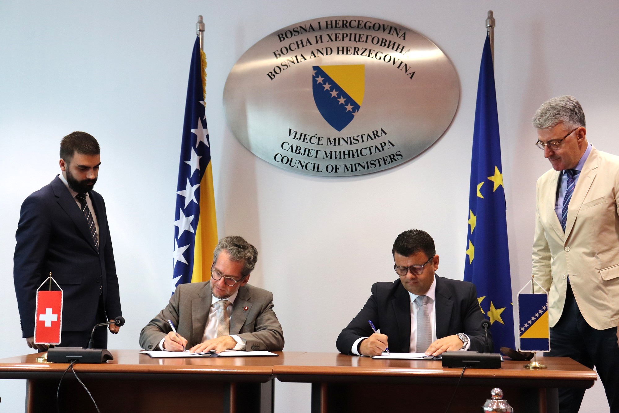 Sporazum su potpisali Sevlid Hurtić, ministar za ljudska prava i izbjeglice Bosne i Hercegovine i direktor za saradnju u Ambasadi Švicarske u BiH Siroco Messerli.