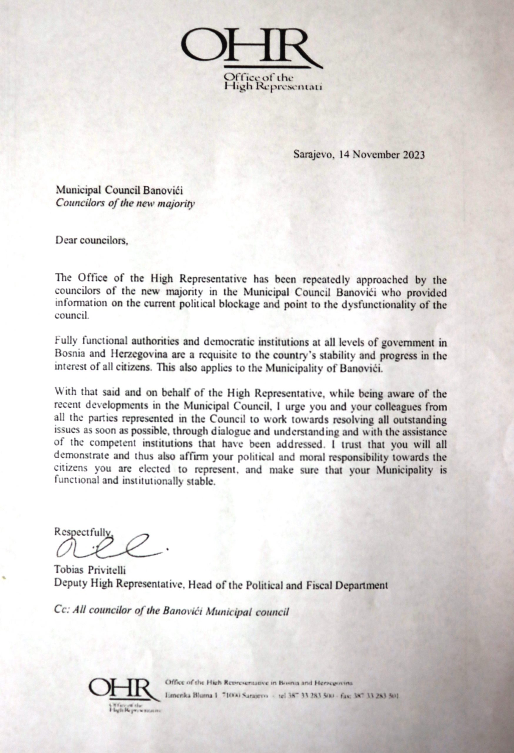 Poštujući mišljenje OHR-a BiH kao predsjedavajući Općinskog vijeća Banovići, u skladu sa Statutom općine Banovići i Poslovnikom o radu OV Banovići, sazvat ću sjednicu Kolegija OV Banovići na kojoj će se razmatrati zahtjev navedene grupe vijećnika, te ću u skladu sa članom 59. Poslovnika o radu Općinskog vijeća Banovići utvrditi termin održavanja nove sjednice. O terminu njenog održavanja svi vijećnici će biti pismeno obavješteni. Ostaje da se vidi hoće li se 14 vjećnika odazvati na ovaj poziv ili će nastaviti sa političkim blokadama i dalje bojkotovati rad Vijeća. Posljedice blokada i nerada OV Banovići nažalost snosit će građani na koje se isti pozivaju cijelo vrijeme˝, naveo je u saopćenju za javnost predsjedavajući Općinskog vijeća Banovići Robert Lapčević.