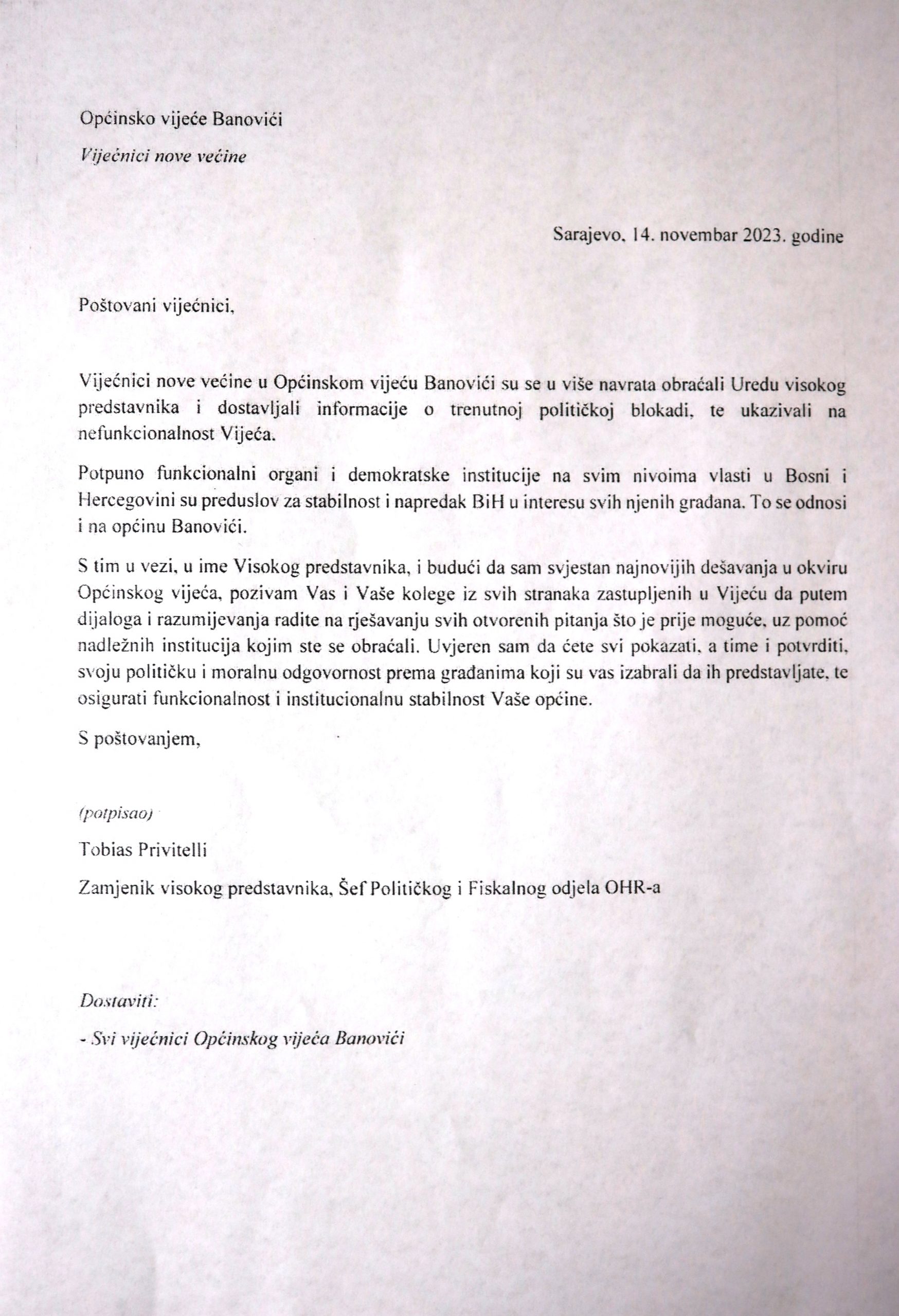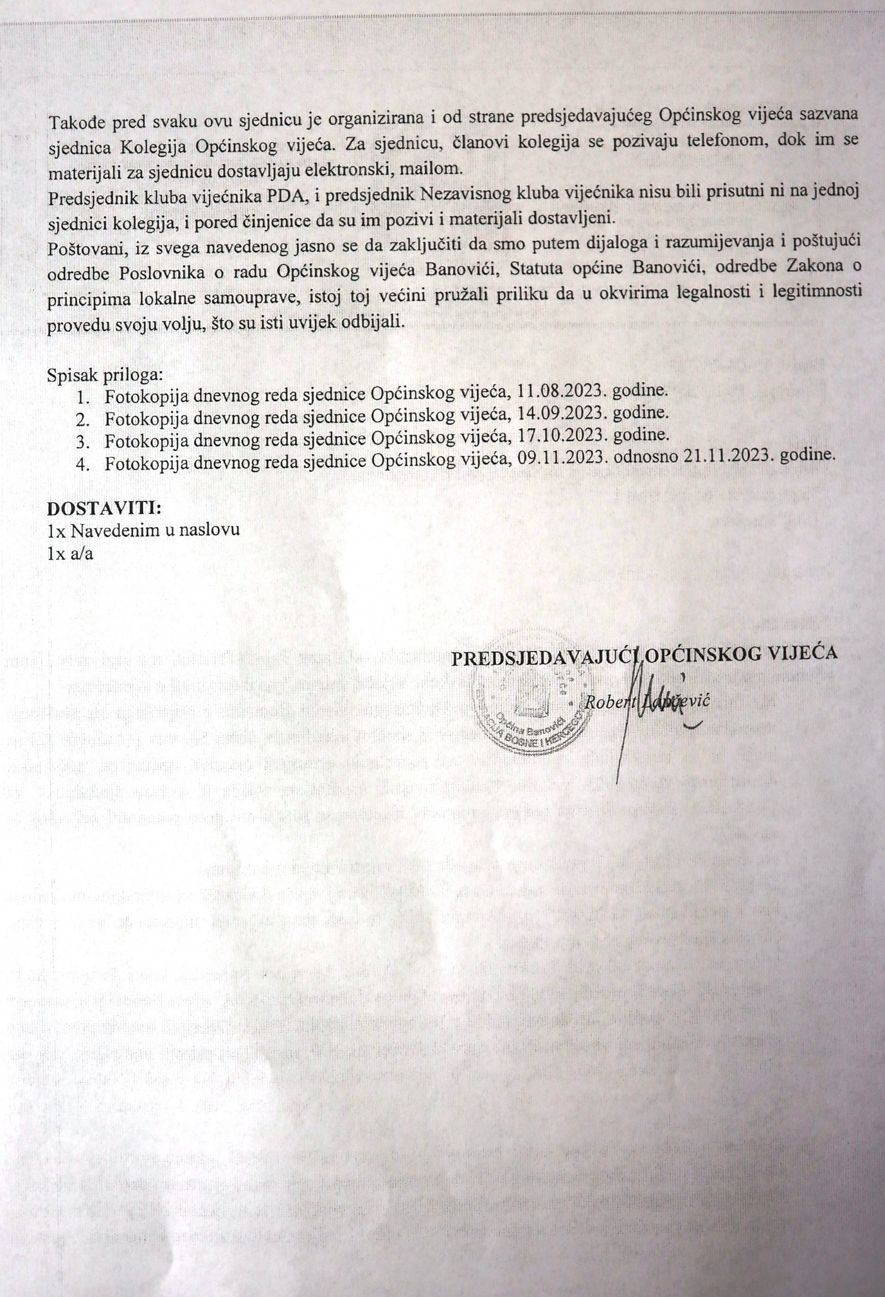 Apsurdno je da se pritom pozivaju na akt OHR-a BiH od 14.11.2023. godine, s obzirom da se u istom aktu vijećnici svih stranaka zastupljenih u Vijeću pozivaju da putem dijaloga i razumjevanja rade na rješavanju svih otvorenih pitanja što prije je moguće. Oni su svojim dosadašnjim postupcima pokazali koliko su zapravo za dijalog i razumjevanje.