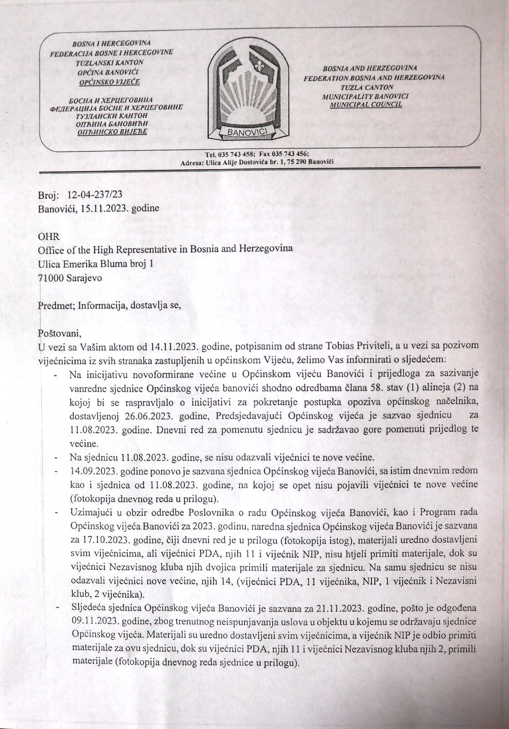 ˝Nova većina u Vijeću ponovo je imala priliku da prisustvuje redovnoj sjednici koju sam zakazao u skladu sa članom 59. Poslovnika o radu Općinskog vijeća Banovići i da donese sve svoje ranije odluke pa i Odluku o opozivu načelnika Gutića, ali nažalost oni su se odlučili na bojkot. Samim tim onemogućeno je razmatranje i usvajanje nekoliko bitnih odluka za život građana naše Općine, poput Nacrta budžeta općine Banovići za 2024. godinu te prijedloga Odluke o stipendiranju učenika i studenata sa područja općine Banovići za školsku/akademsku 2023./2024. godinu.