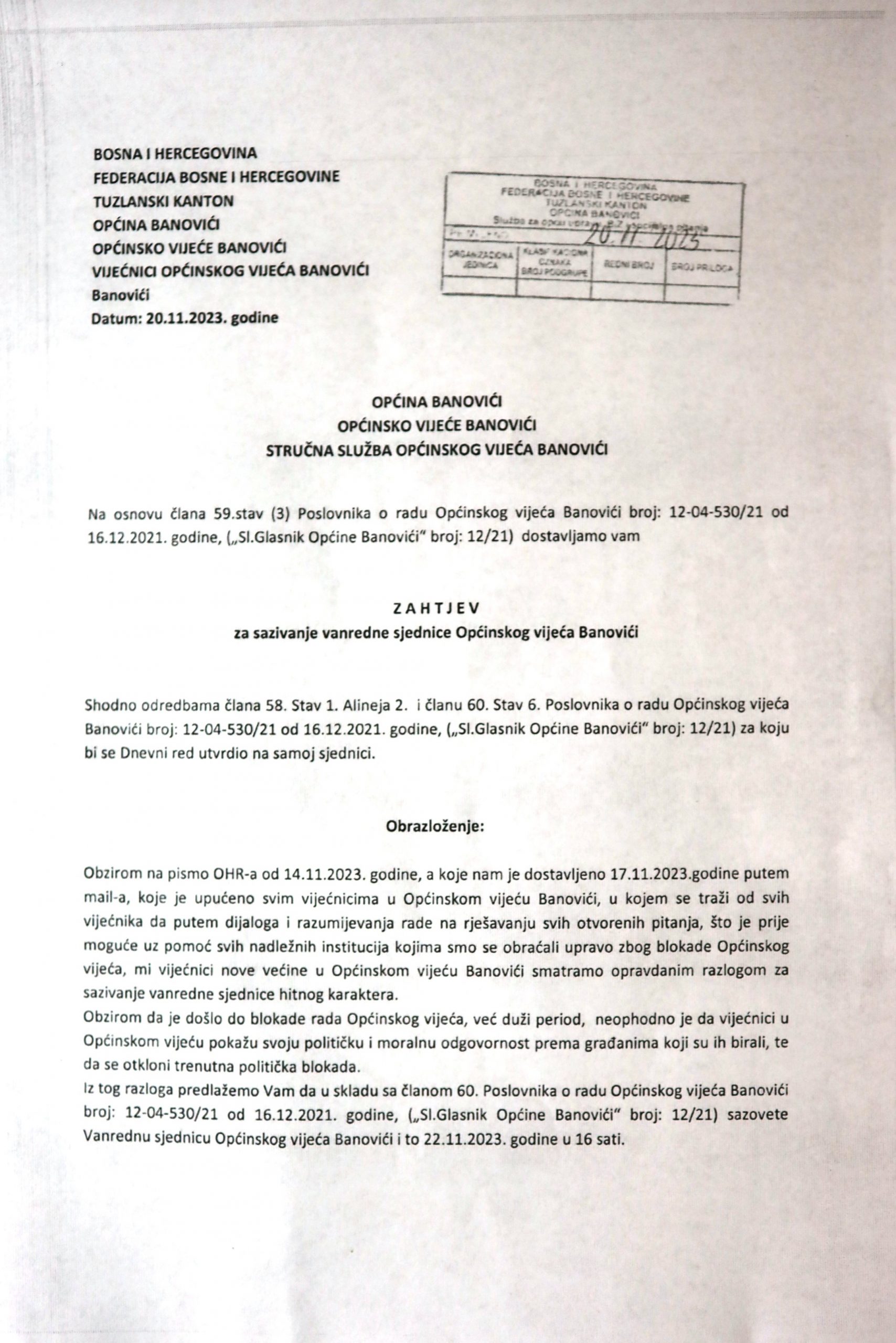 Apsurdno je da ti isti vijećnici u svom zahtjevu od 20.11.2023. godine traže od Stručne službe OV Banovići zakazivanje vanredne sjednice za 22.11.2023. godine, a kako navode u cilju otklanjanja trenutne političke blokade, iako su imali priliku da dan ranije (21. novembra) dođu na 33. redovnu sjednicu te odblokiraju rad Vijeća. Također, to su mogli uraditi i na sjednicama zakazanim za 11.08., 14.09. i 17.10.2023. godine a što nisu uradili. Javnost treba da zna da zakazivanje sjednice Vijeća nije u nadležnosti Stručne službe Vijeća, nego je to isključiva nadležnost predsjedavajućeg ili zamjenika predsjedavajućeg, sukladno članu 59. Poslovnika o radu OV Banovići. Samim tim vijećnici koji čine novu parlamentarnu većinu nisu nadležni da utvrđuju termin održavanja sjednice.
