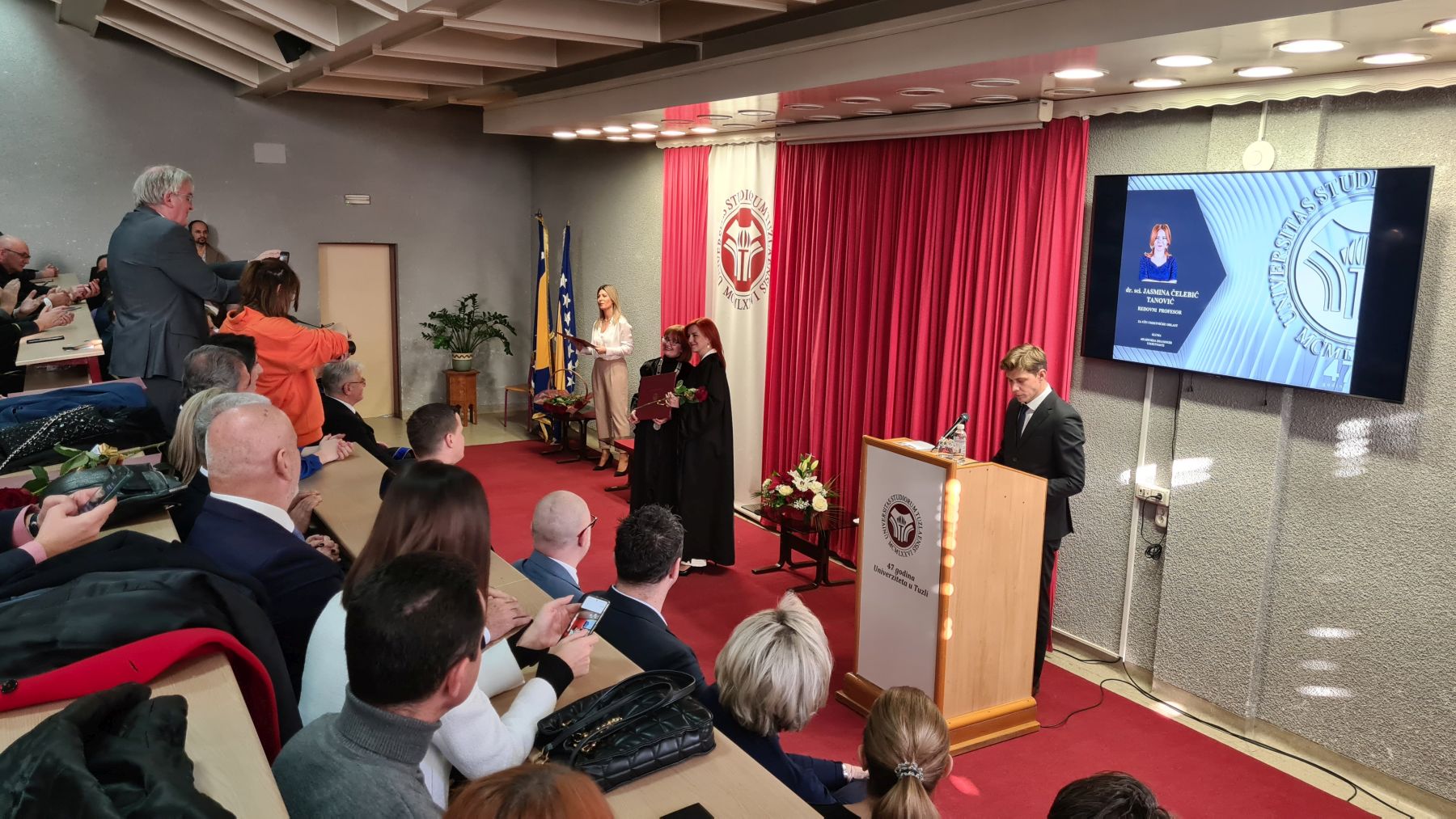 Najsvečaniji trenutak danas bila je dodjela zlatnih plaketa najboljim studenticama i studentima Univerziteta u Tuzli, kao i dodjela priznanja profesorima koji su izabrani u trajno zvanje redovni profesor, kao i dodjela počasnih zvanja profesor emeritus.