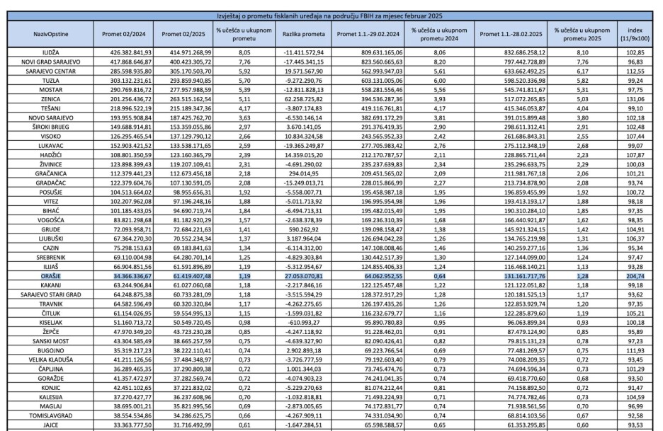 Porezna uprava FBiH objavila je podatke o fiskalnom prometu po opštinama i gradovima u Federaciji BiH za period od 1. januara do 28. februara ove godine.