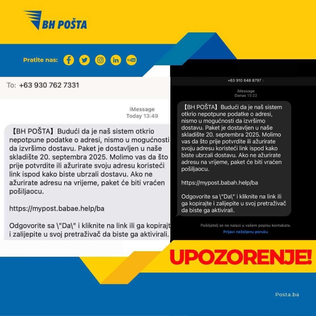 Zvanične institucije, uključujući BH Poštu, nikada ne šalju poruke putem sumnjivih linkova niti traže potvrdu adrese na ovaj način.