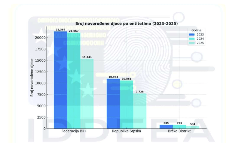 Prema podacima iz evidencija koje održava Agencija za identifikacione dokumente, evidenciju i razmjenu podataka Bosne i Hercegovine (IDDEEA BiH), u periodu od 2023. do 2025. godine zabilježen je kontinuiran pad nataliteta u cijeloj državi.