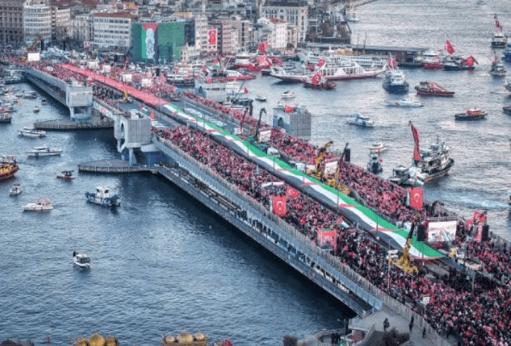 Oko 520.000 ljudi okupilo se na istanbulskom Galata mostu na masovnom maršu podrške Palestini, organizovanom pod okriljem Saveza za humanost i Platforme nacionalne volje.