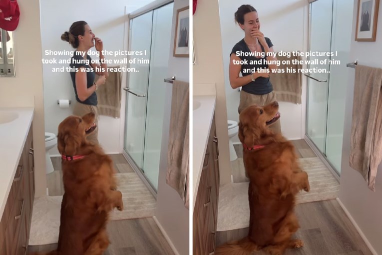 U snimci vlasnica psu pokazuje uokvirene fotografije koje je stavila na zid kupaonice, a na kojima se nalazi upravo on. Retriver sjedi ispred zida, maše repom i s velikom pažnjom promatra svoje portrete, prateći vlasnicu pogledom dok mu pokazuje svaku sliku. U jednom trenutku čak se pokušava približiti fotografijama kako bi ih bolje vidio, što dodatno naglašava njegovu znatiželju i uzbuđenje.