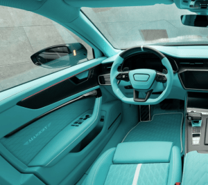 Ulaskom u unutrašnjost, dojam postaje još intenzivniji. Kabina je gotovo u potpunosti obojena u tirkiznu boju, koja prekriva gotovo sve površine: od prošivenih kožnih sjedala, obloga vrata i tepiha, do armaturne ploče, sigurnosnih pojaseva pa čak i stropa s efektom zvjezdanog neba.