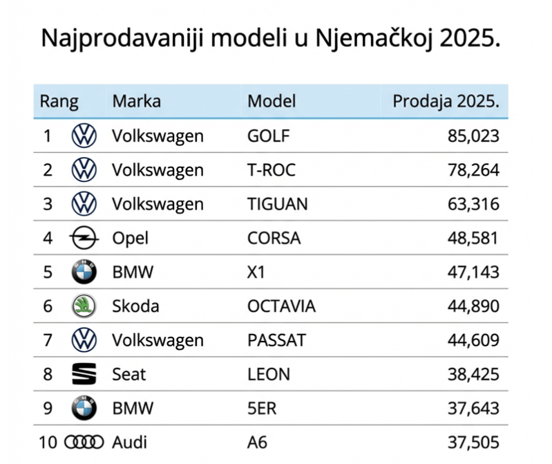 Volkswagen je i u 2025. godini potvrdio apsolutnu dominaciju na domaćem, njemačkom tržištu, gdje su čak tri njegova modela zauzela vrh ljestvice najprodavanijih. Već treću godinu zaredom, titule najpopularnijih ponijeli su Volkswagen Golf, T-Roc i Tiguan.