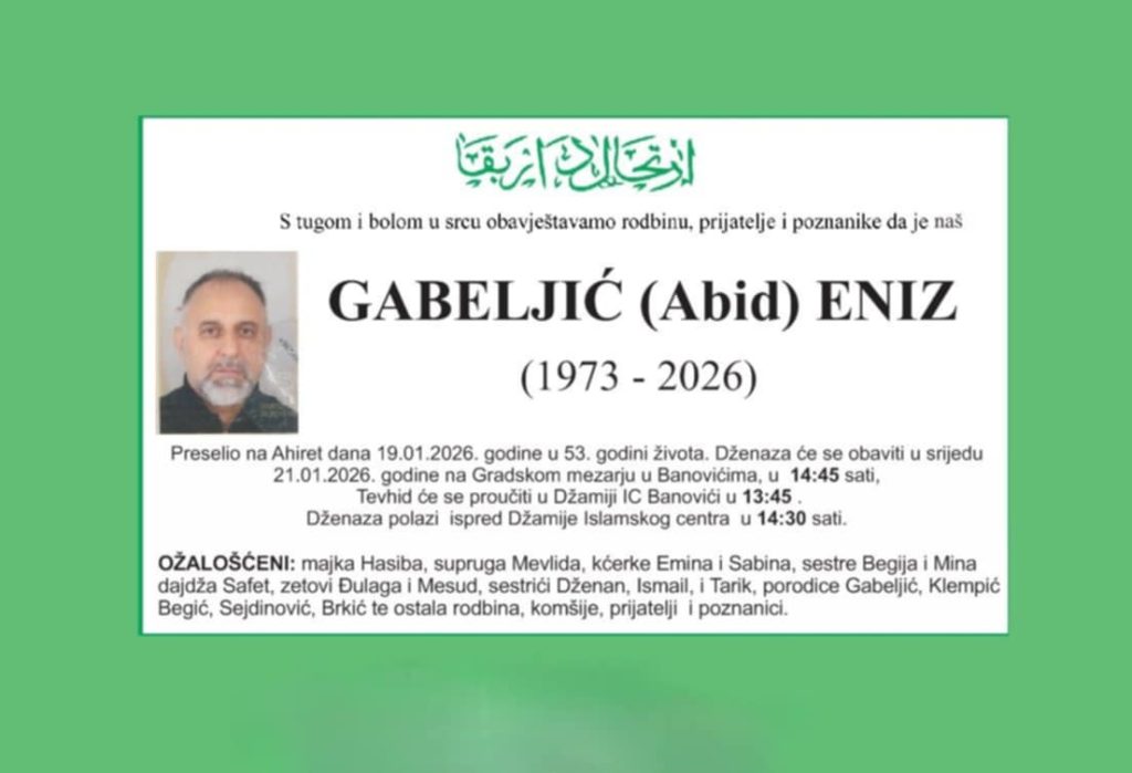 Jutros je nakon kraće bolesti u 53. godini preminuo Eniz Gabeljić. Bio je muzičar, kompozitor, aranžer, producent i učitelj u školi. Rođen je 1973. godine u Srebrenici, gdje je završio osnovnu školu i Srednju elektrotehničku školu. Muzikom se počeo baviti kao srednjoškolac. Svirao je violinu u KUD-u “Vaso Jovanović”, a paralelno je gradio vlastiti put, oslanjajući se na rad, sluh i upornost.