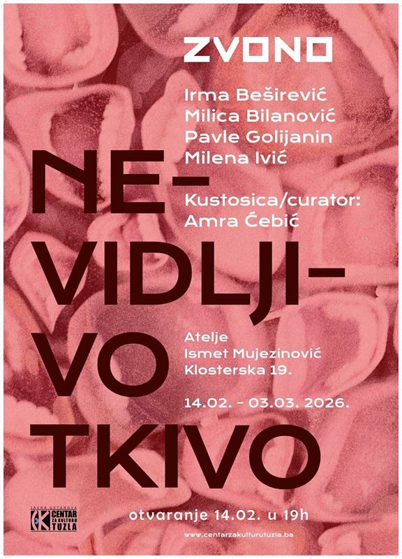 Otvaranje izložbe radova finalista nagrade “Zvono”, koja nosi naziv “Nevidljivo tkivo” će biti otvorena u subotu, 14.februara 2026.godine u 19:00 časova, u ateljeu “Ismet Mujezinović” Tuzla.