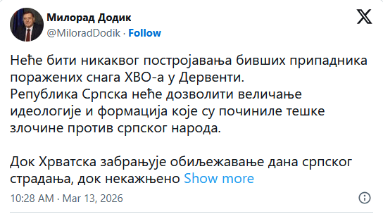 Predsjednik SNSD-a, Milorad Dodik objavio je putem društvene mreže X da u Derventi neće biti nikakvog postrojavanja bivših pripadnika “poraženih snaga HVO-a”.
