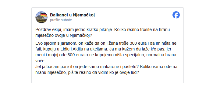 “Pozdrav ekipi, imam jedno kratko pitanje. Koliko realno trošite na hranu mjesečno ovdje u Njemačkoj? Evo sjedim s prijateljem, on kaže da on i žena troše 300 eura i da im ništa ne nedostaje, kupuju u Lidlu i Aldiju na akcijama. Ja mu kažem da pretjeruje, jer meni i mojoj ode 800 eura, a ne kupujemo ništa posebno, normalna hrana i voće. Bacam li ja novac ili on živi na tjestenini i pašteti? Koliko vama ode na hranu mjesečno, pišite iskreno da vidim tko je ovdje u krivu?”